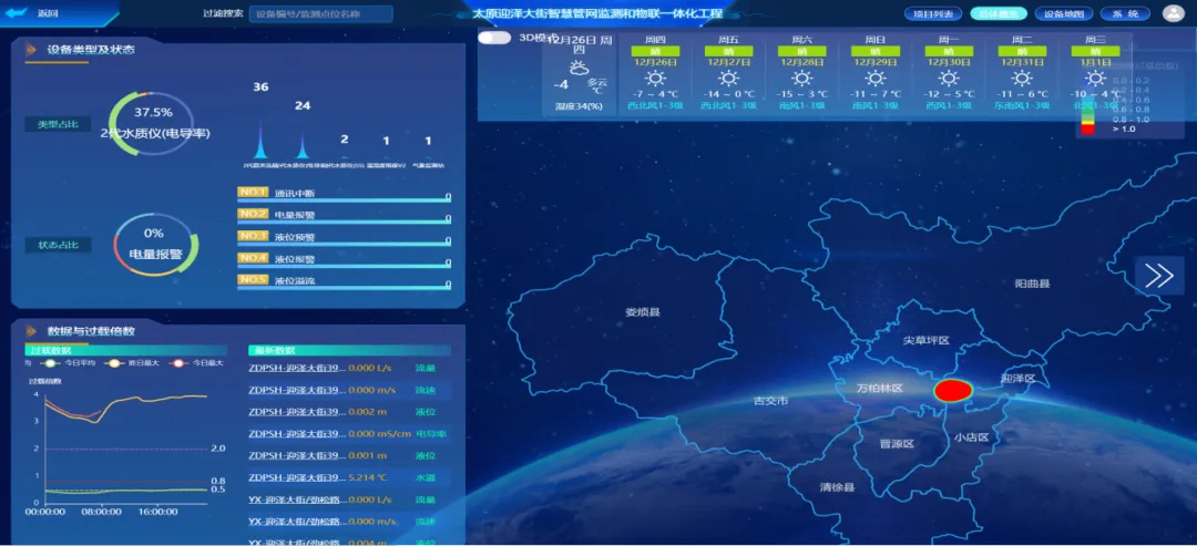 太原市城市排水生命線安全運行監測項目通過整合城區雨污水管網、泵站、污水廠、河道排口、重點排水戶、低洼積水點等相關數據,接入泵站運行數據、污水廠運行數據、排污量、低洼積水點液位、泵站視頻、水雨情、氣象等信息,實現對全市雨污管網、泵站、污水廠及其他相關附屬設施的智能監測管控,建成一個集信息共享、綜合運行監控、應急處置、輔助決策分析于一體的多功能綜合管理平臺,為排水業務管理、防澇指揮等提供支持,構建“源網站廠河”一體化管理的新模式,形成具備實時感知、業務聯動、預警預報、輔助決策和應急調度功能的排水綜合管理體系。