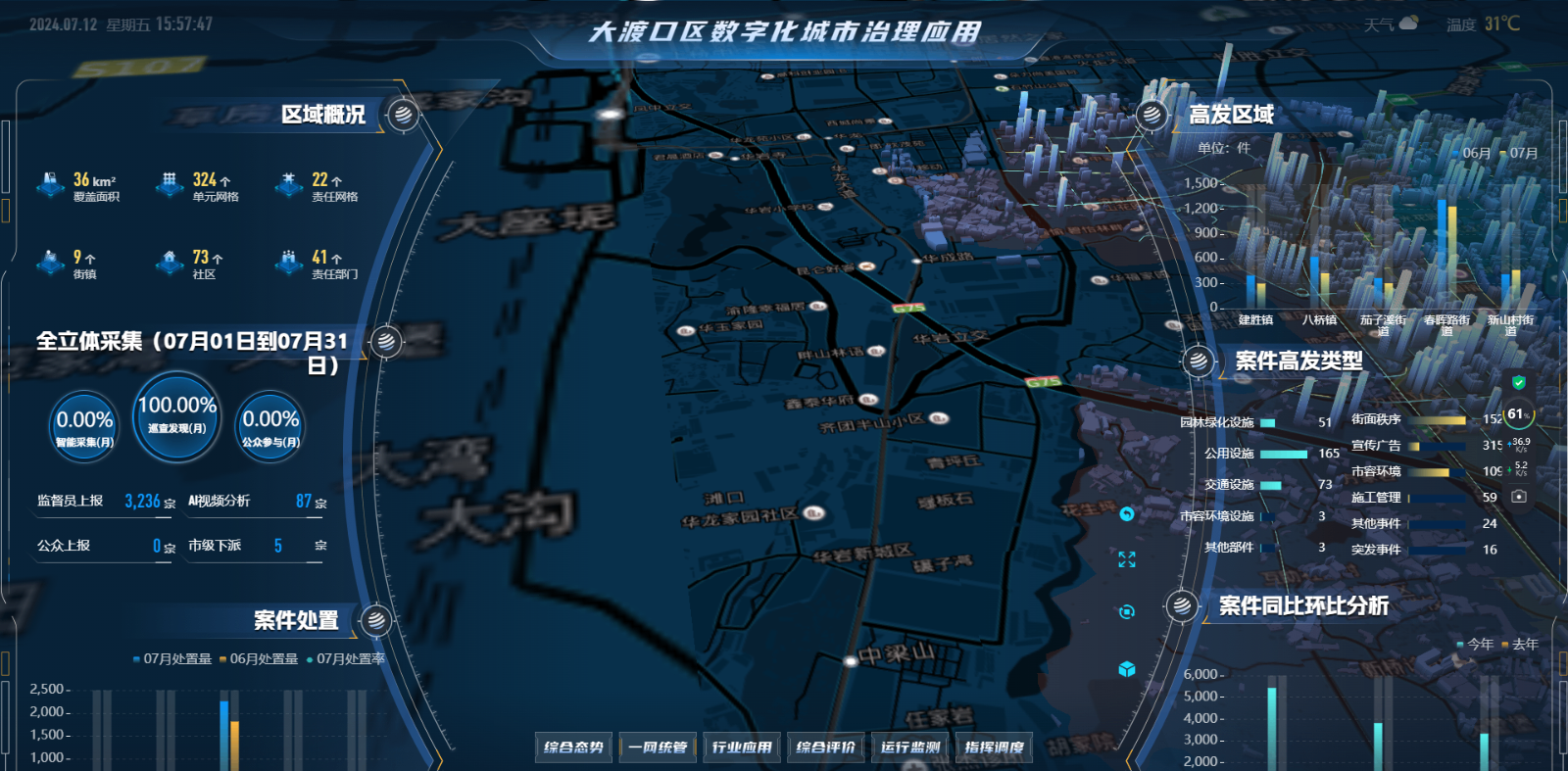 根據(jù)城市運行管理服務平臺建設要求,大渡口區(qū)以原有數(shù)字化城市管理信息系統(tǒng)為基礎升級搭建城市運管服平臺框架,按照集約化、云端化要求,率先將全部應用系統(tǒng)、數(shù)據(jù)庫集中部署在大渡口移民鎮(zhèn)域應急安全中樞云資源中心實現(xiàn)城市運行信息化系統(tǒng)“一云承載”,形成可支撐城市綜合問題“一網(wǎng)運行”的城市運行管理大平臺。通過建立全面的案件采集渠道,以高新科技技術優(yōu)化事件處理流程,打造區(qū)級、街鎮(zhèn)、社區(qū)、網(wǎng)格四級線上網(wǎng)格責任體系,建立問題發(fā)現(xiàn)交辦“一鍵到端”、整改落實督查督辦“一鍵到人”的快速處置機制,形成城市管理“扁平化”模式;建立涵蓋城市管理的全過程的評價體系,補齊管理漏洞,通過進一步明確職責、分工合作的協(xié)同工作體系,加強處置力量實現(xiàn)時空全覆蓋,形成區(qū)級、職能部門、街道、社區(qū)、市民群眾齊抓共管的“大處置”機制的轉變,高效處理城市管理問題。