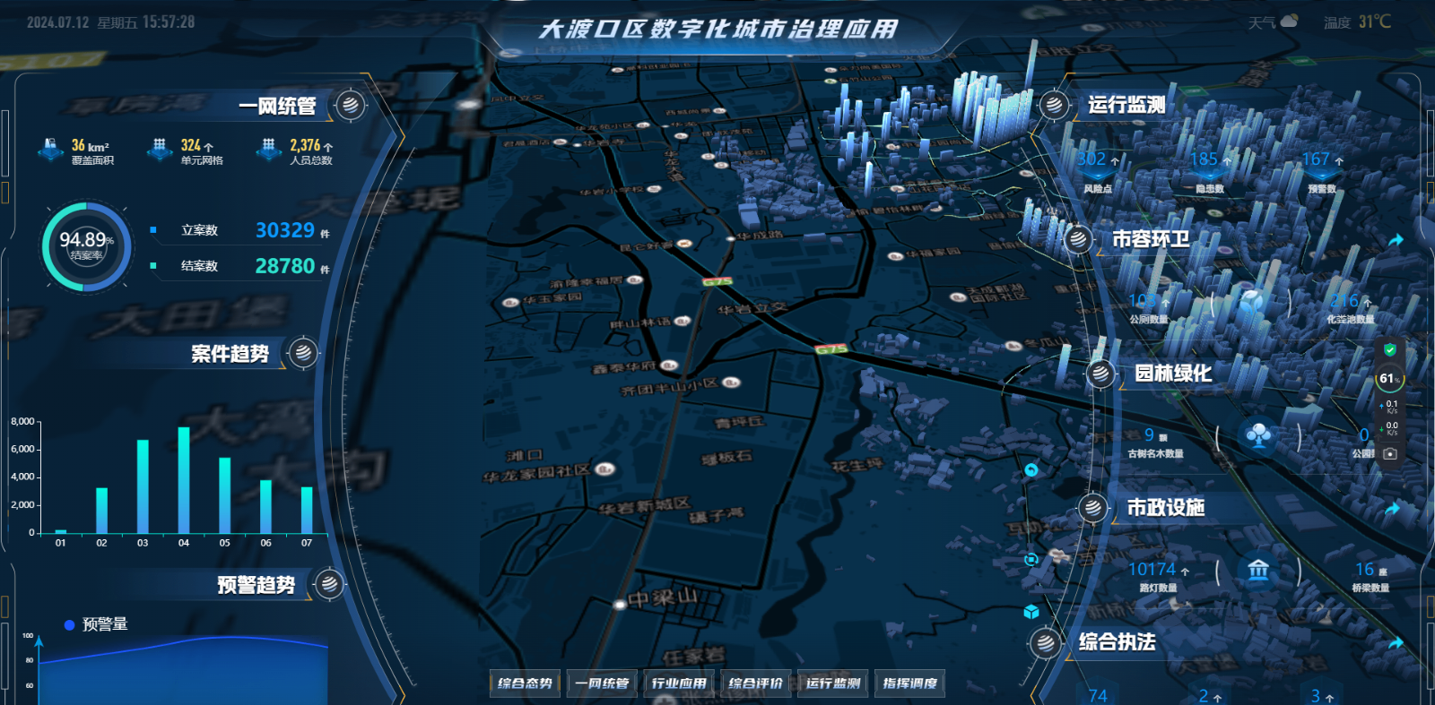 推動城市運行各大基礎業(yè)務融合應用,通過建設大渡口區(qū)市政設施、市容環(huán)衛(wèi)、園林綠化、綜合執(zhí)法等城市管理業(yè)務應用,推動實現(xiàn)城市管理問題“全面發(fā)現(xiàn)、及時預警、精準定位、快速處置、智能跟蹤、科學評價”,城市管理作業(yè)“全實名、全過程、全方位、全覆蓋、全評價”,城市安全應急“全面預測、快速響應、智能決策、聯(lián)合處置、持續(xù)跟蹤”,逐步實現(xiàn)城市管理向城市治理的轉變。