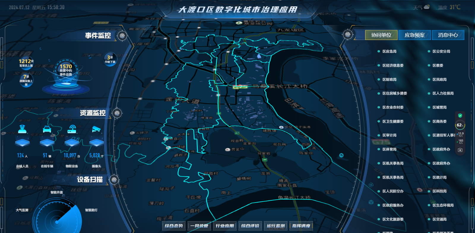 大渡口區(qū)城市運行管理服務平臺結合區(qū)移民鎮(zhèn)域應急安全中樞物信融合數(shù)據(jù)資源平臺,補充城市管理、應急安全相關的物信融合數(shù)據(jù)資源池、感知數(shù)據(jù)資源池,形成大渡口區(qū)統(tǒng)一的城市運行數(shù)據(jù)底座,共享匯集城市運行各部門數(shù)據(jù),實現(xiàn)數(shù)據(jù)跨行業(yè)、跨部門共享互聯(lián),構建大渡口區(qū)城市運行智能中樞基本框架和數(shù)據(jù)資源體系。目前通過聚焦城市管理、交通態(tài)勢和工地安全監(jiān)控等各類安全感知終端,建設了66路視頻攝像頭、包含化糞池氣體感知設備、垃圾中轉站監(jiān)測設備、公園環(huán)境監(jiān)測設備、城市執(zhí)法配套設備等177套物聯(lián)感知監(jiān)測設備,整合接入原有公安、消防、工地視頻,最終實現(xiàn)全區(qū)約8000余點位視頻攝像頭及物聯(lián)感知點位覆蓋。通過物聯(lián)感知、視頻分析健全城市管理“神經(jīng)網(wǎng)絡”,補充原有靜態(tài)管理信息,實現(xiàn)對城市管理基礎設施運行數(shù)據(jù)的實時監(jiān)控,提高城市基礎設施的物聯(lián)感知和全量數(shù)據(jù)在線采集能力。