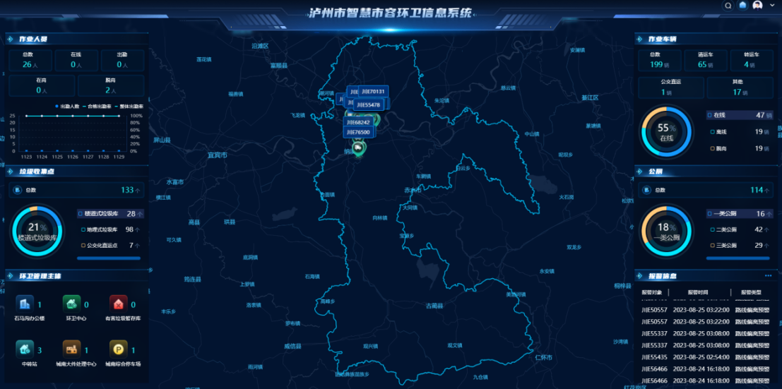 平臺對主城區(qū)多家環(huán)衛(wèi)服務(wù)企業(yè)、1000余名環(huán)衛(wèi)作業(yè)工人、70余臺作業(yè)車輛進行科學(xué)智慧監(jiān)管,通過對環(huán)衛(wèi)企業(yè)、作業(yè)人員、車輛的規(guī)范化管理,做到智慧監(jiān)管有抓手,考核有數(shù)據(jù)管理、數(shù)據(jù)說話的新模式。通過智慧化技術(shù),環(huán)衛(wèi)企業(yè)的人員、車輛配置率提高到100%,建成區(qū)道路機械化清掃率達到92%,道路掃凈率達到95%,市容質(zhì)量提升了70%,政府資金投入使用率達100%。此外平臺對接了智慧廣告一體化平臺和瀘州市靜態(tài)交通可視化平臺,實現(xiàn)戶外廣告和停車數(shù)據(jù)的信息化管理。