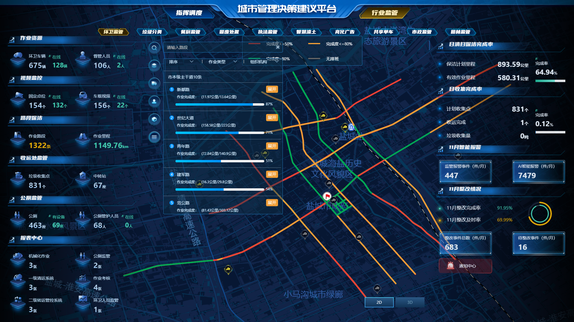 城市運行一屏可觀。按照“一圖知全局、一屏觀全城”的要求,通過可視化呈現方式,實現圖上作業的工作模式,如在環衛管理方面,通過一張圖可以實時掌握每一個垃圾投放點的垃圾清運了沒有,每一輛垃圾清運車去了哪些投放點,裝運了多少垃圾,什么時候運到了處置場。針對環衛作業有遺漏或不合規的可進行實時調整作業計劃,如調整收運線路和收運趟次,從而確保環衛作業更加規范科學,也更有成效。建立了“城市管理駕駛艙”宏觀展示城市管理的整體運行情況,實時感知城市整體體征、智能預警城市運行問題、分析研判城市運行態勢,匯聚指揮協調、綜合評價、智慧環衛、智慧執法等板塊核心指標數據,實現城管重要數據分析指標一屏統覽,輔助監督與決策。