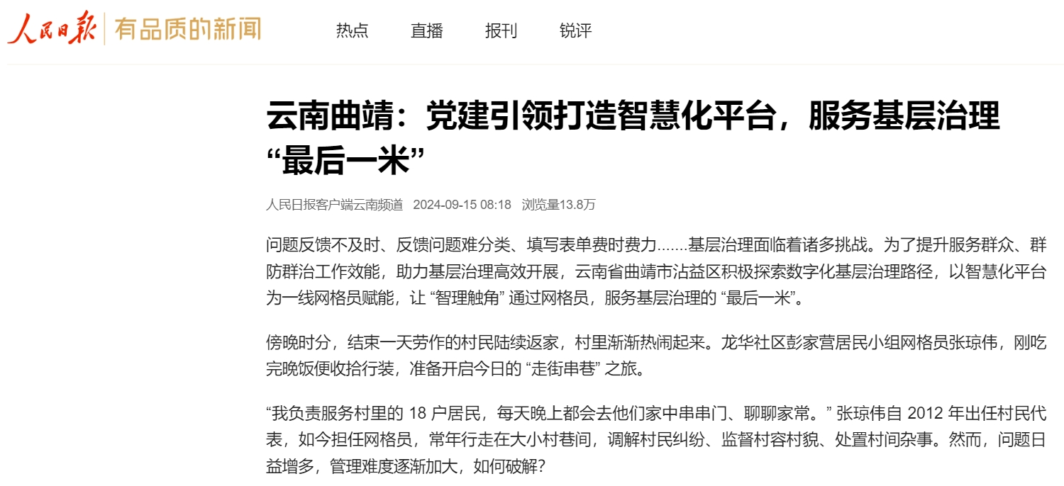 圖元項(xiàng)目案例登《人民日?qǐng)?bào)》| 云南曲靖:黨建引領(lǐng)打造智慧化平臺(tái),服務(wù)基層治理 “最后一米”
