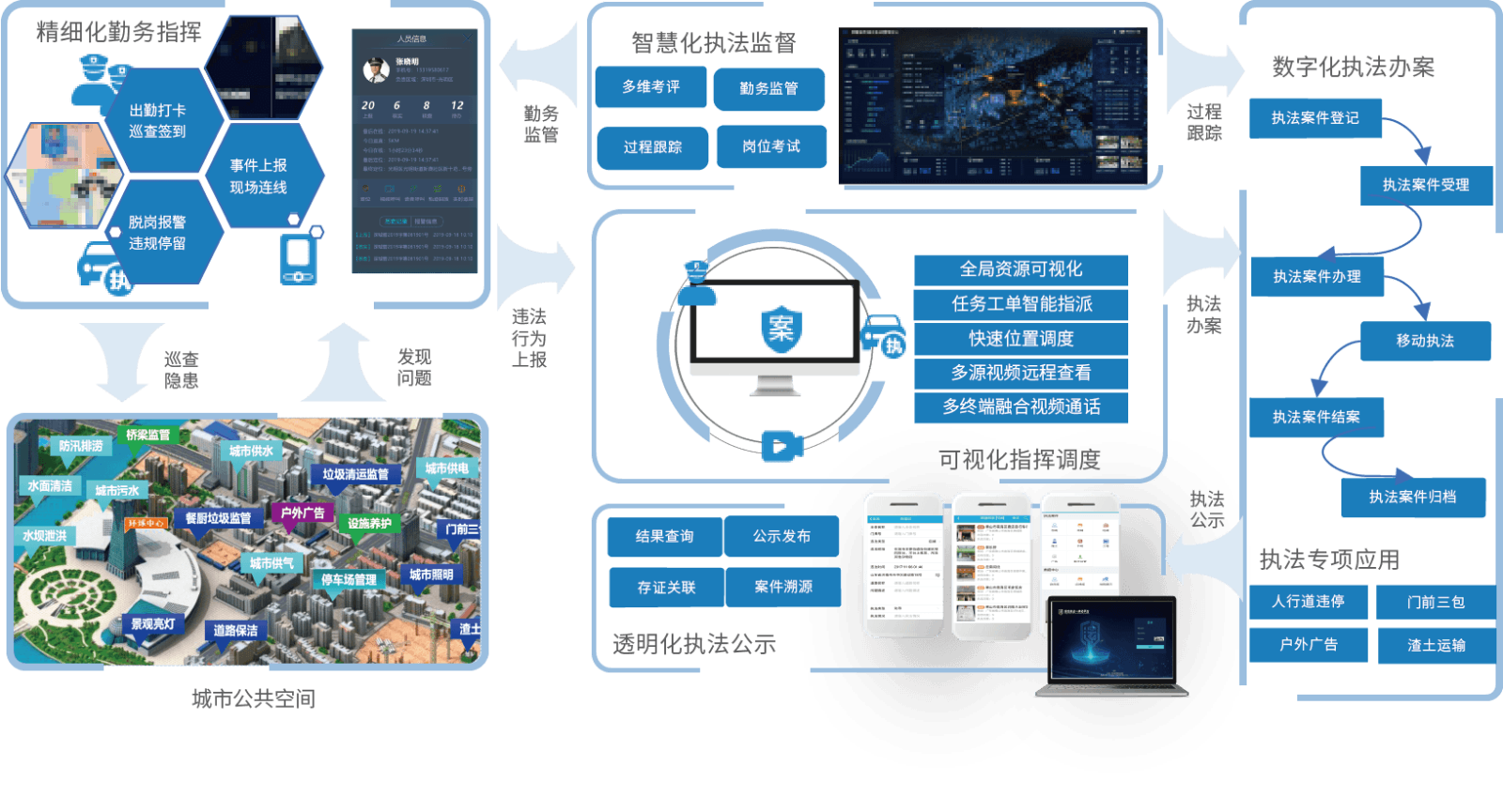 智慧執法平臺響應國家執法體制改革、順應“智慧執法”發展趨勢,結合“執法重心下移”特點、滿足行政執法單位一線需求,融入云計算、物聯網、人工智能、大數據、GIS地圖、3D可視化、區塊鏈、視音頻通訊等先進技術。全面覆蓋執法勤務管理、日常指揮調度、執法辦案管理、執法監督考核、執法公示管理、執法專項應用、非接觸式執法等應用,一條線打通“智慧執法”全流程,構建執法工作閉環,全面提升行政執法的精細化、智慧化的水平。